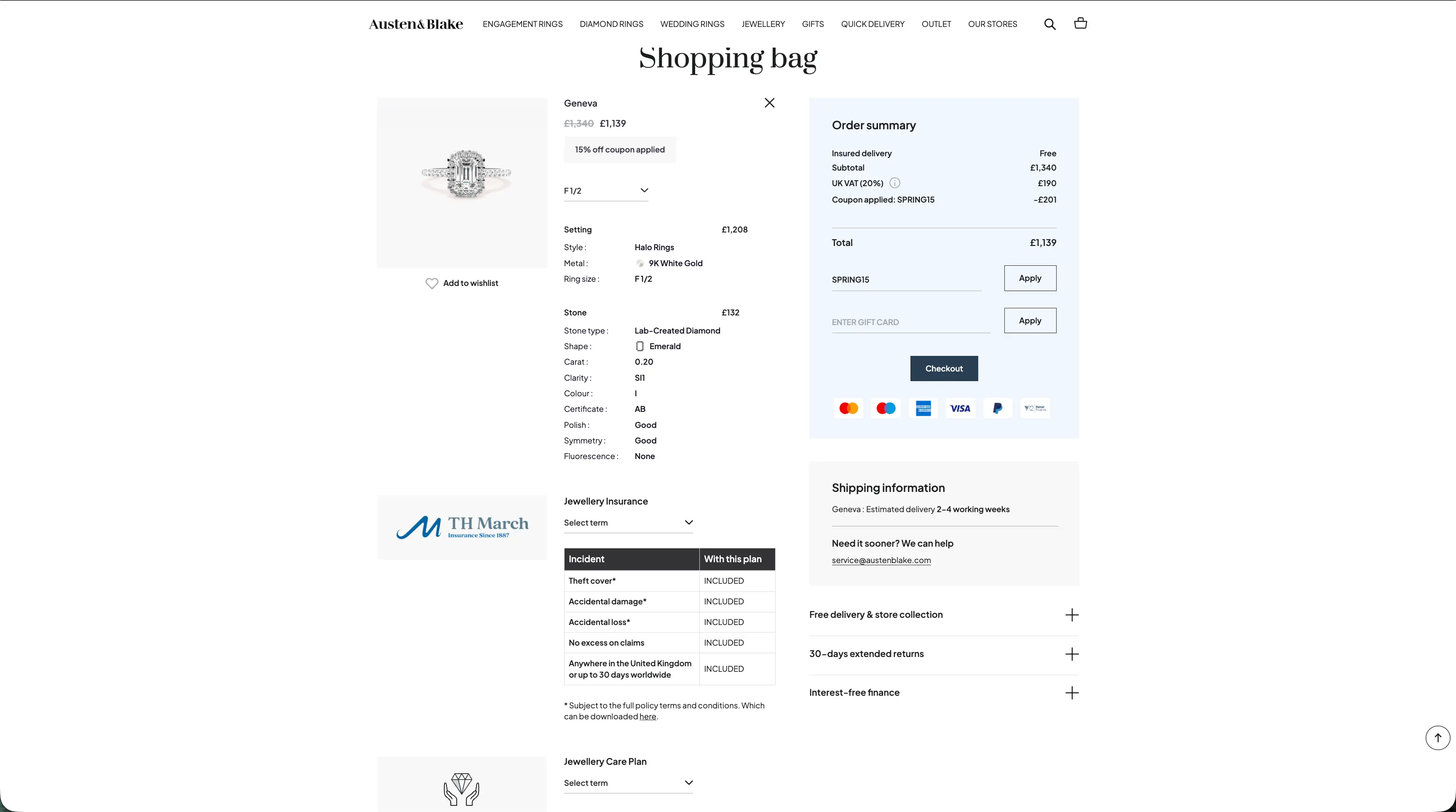 - Shopping bag with coupon codes, gift cards, and integrated jewellery insurance (TH March)