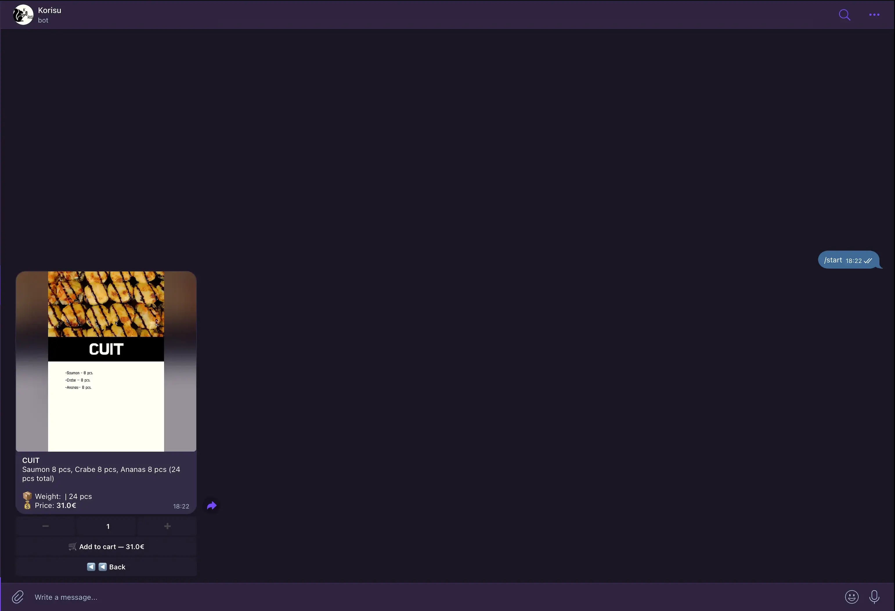 Korisu is a Telegram ordering bot built for a sushi restaurant in Strasbourg, France. Customers browse the full menu by category, view individual dishes with photos and pricing, manage a cart, and place delivery or pickup orders — all without leaving Telegram. Confirmed orders are pushed in real time to a private Telegram group for the restaurant team and logged to Google Sheets.